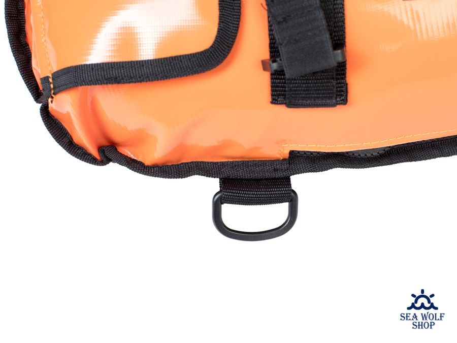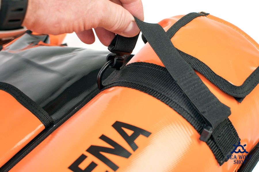 Снизу и по бокам буй-лодка снабжена 11 большими пластиковыми полукольцами для крепления дополнительных аксессуаров, плечевых лямок для переноски и для закрепления буйрепа, то есть линя соединяющего подводного охотника с плотиком.