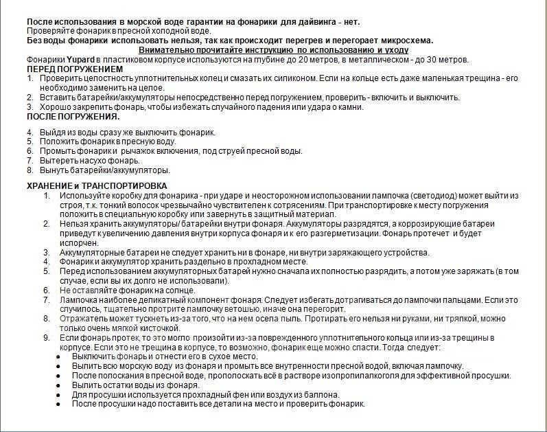 Предупреждение: фонарь предназначен для использования только в воде. При использовании на суше диод фонаря сгорит.