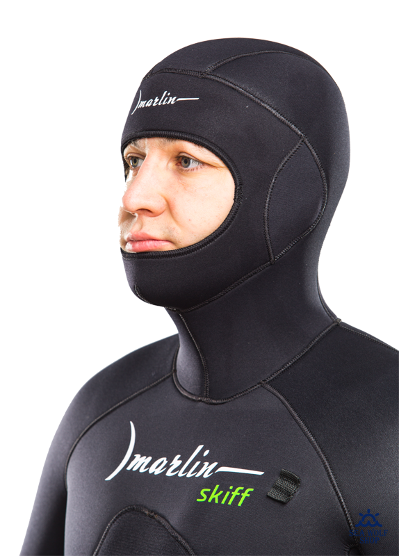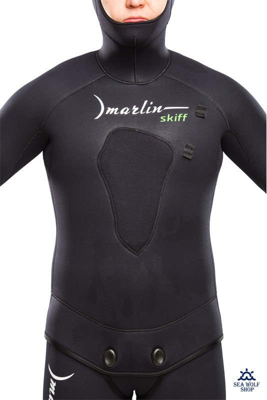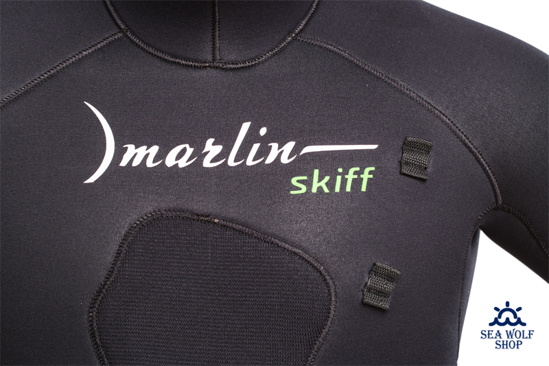 В гидрокостюме Marlin Skiff 2.0 есть крепление для ножа, расположенное на груди слева, и упор для зарядки ружей, приклеенный к костюму и прошитый по периметру, что исключает отрывание упора в процессе его эксплуатации.
