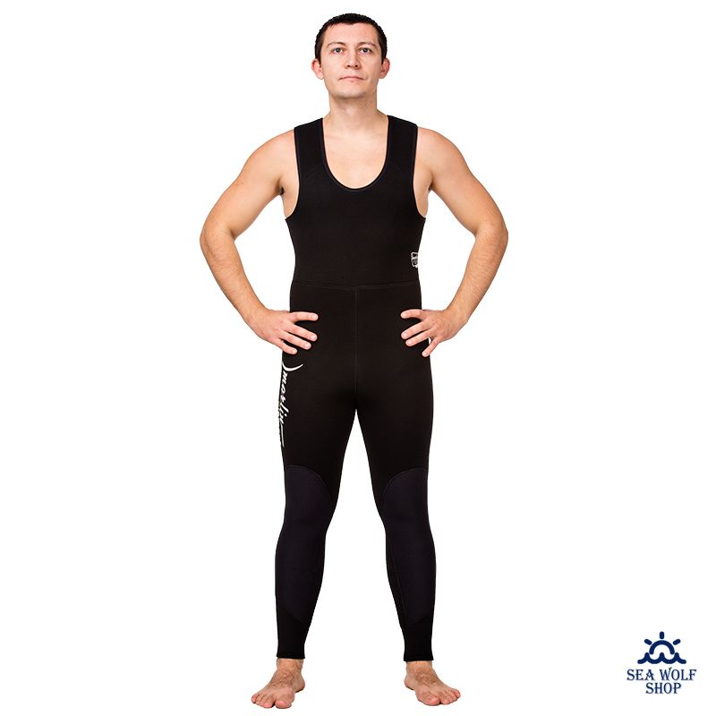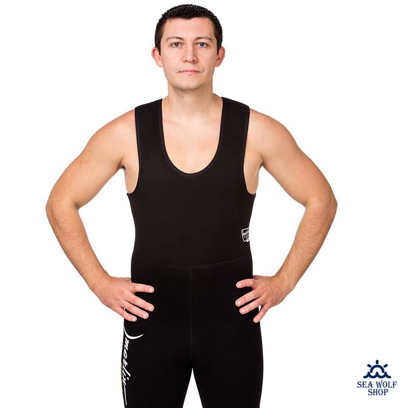 В брюках-комбинезоне, для максимального сохранения тепла, увеличена площадь неопрена в области майки на спине. В области майки применяется толщина неопрена 7 мм. Свободный край майки прошит эластичной лентой.