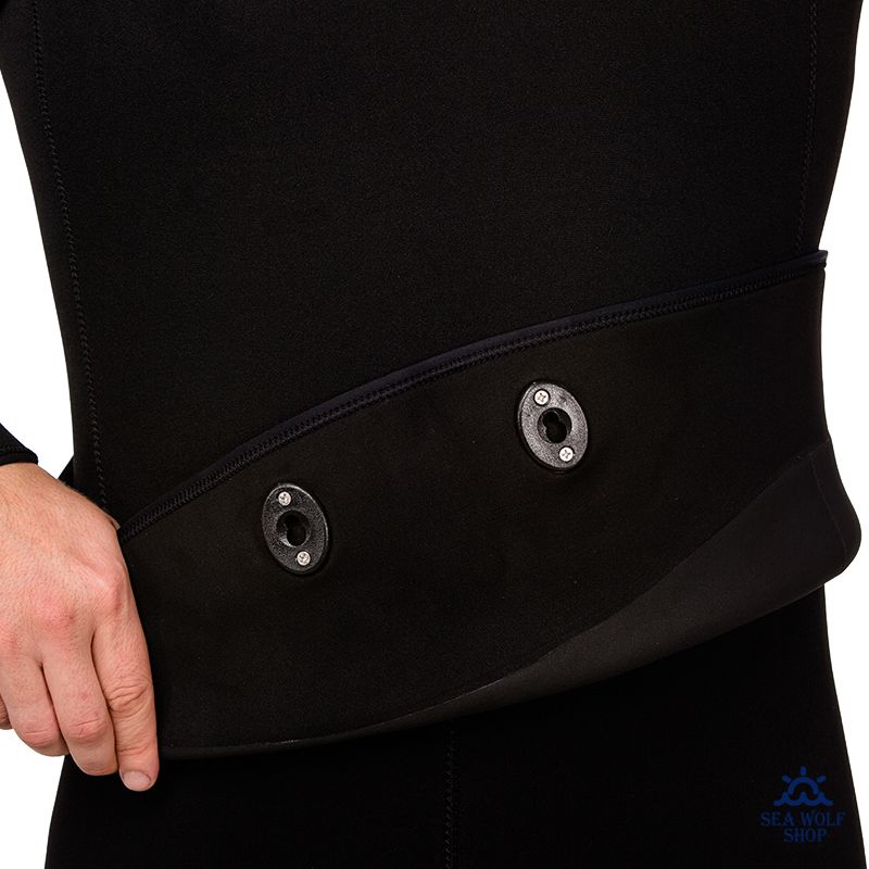 Гидрокостюм не имеет упора для зарядки ружей на груди, что облегчает дыхание подводного пловца.