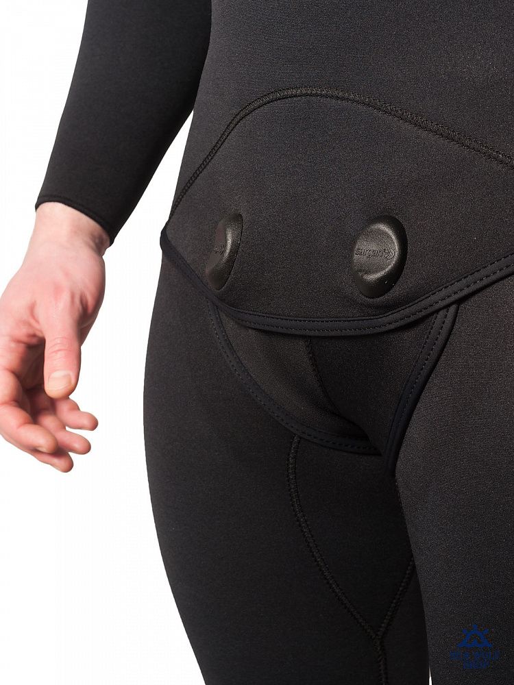 Здесь же, на груди, костюм из неопрена имеет крепления под нож.