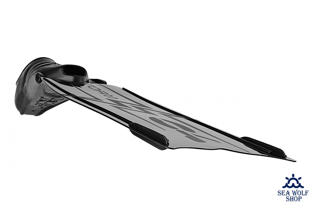 Лопасти из технополимера TPU. Работают без помех от направляющих стабилизаторов и с минимальным боковым скольжением. По длине проходят ребра жесткости. Угол слома 29°, что в сумме с 3° угла калоши доводит угол до 32°. На тыльной стороне два доп. ребра, чтобы снизить нагрузку на ласты, если ныряльщик стоит на дне.