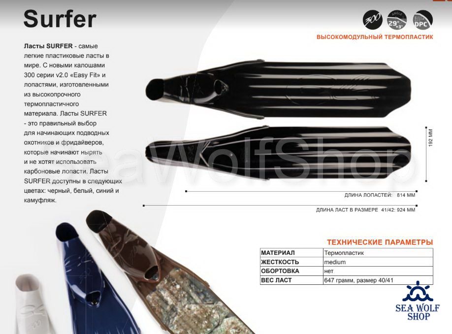 Марка (бренд) C4 CARBON / Модель (коллекция) SURFER / Страна ИТАЛИЯ / Назначение Подводная охота, Фридайвинг / Материал Модульный пластик / Длина, мм 814 Ширина, мм 192 Угол излома 28°