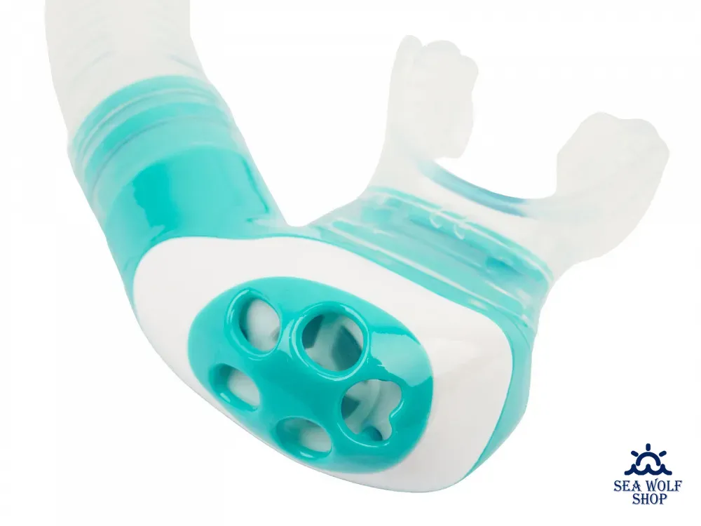 В верху установлен «СУХОЙ» клапан, предотвращающий попадание воды в трубку. Такая система при частых недолгих погружениях создает комфорт ныряльщику.