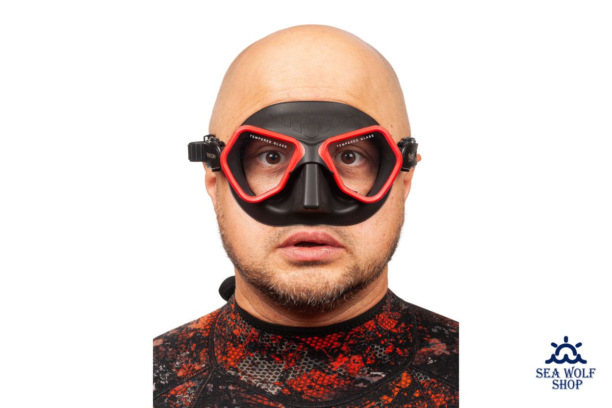 Двухстекольная маска, выполненная по безрамочной технологии, стекла впрессованы в обтюратор маски. Внешне и внутреннее покрытие обтюратора выполнено из гипоаллергенного матового силикона, чтобы избежать отражения света на лице и бликов внутри маски. Силикон маски очень мягкий и подходит практически для любой анатомии лица.