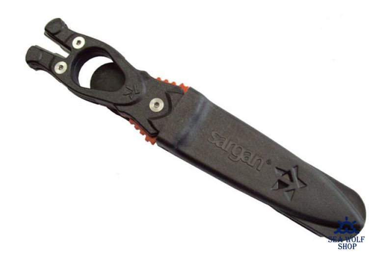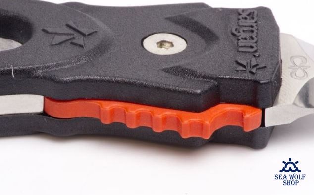 Удлиненная вогнутая линия реза, существенно облегчает разрезание одним движением различного рода шнуров, лесок, сетей - смертельную опасность для подводного охотника.