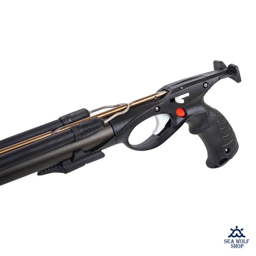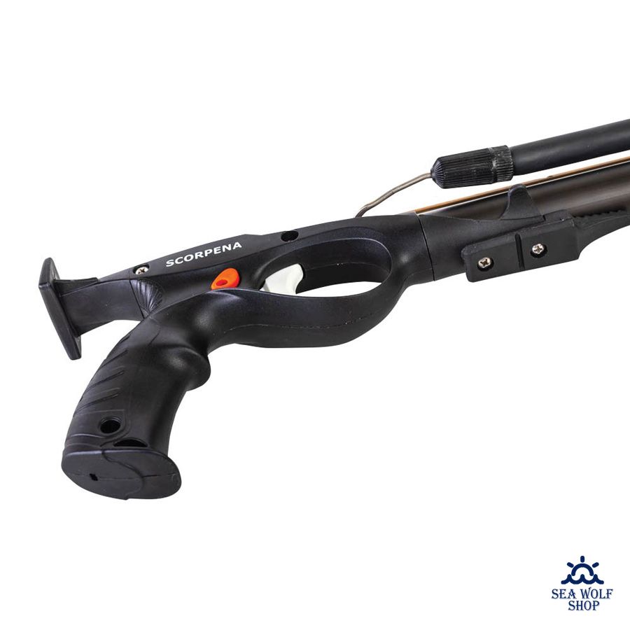 Максимальное удобство обеспечивает рукоятка анатомической формы из прочного пластика чёрного цвета, чтобы не демаскировать подводного охотника. Съёмный упор в ее торцевой части облегчает заряжание. Спусковой крючок и линесбрасыватель выполнены из контрастного пластика ярко-белого цвета. Кнопка предохранителя изготовлена красной – для лучшего визуального обнаружения.