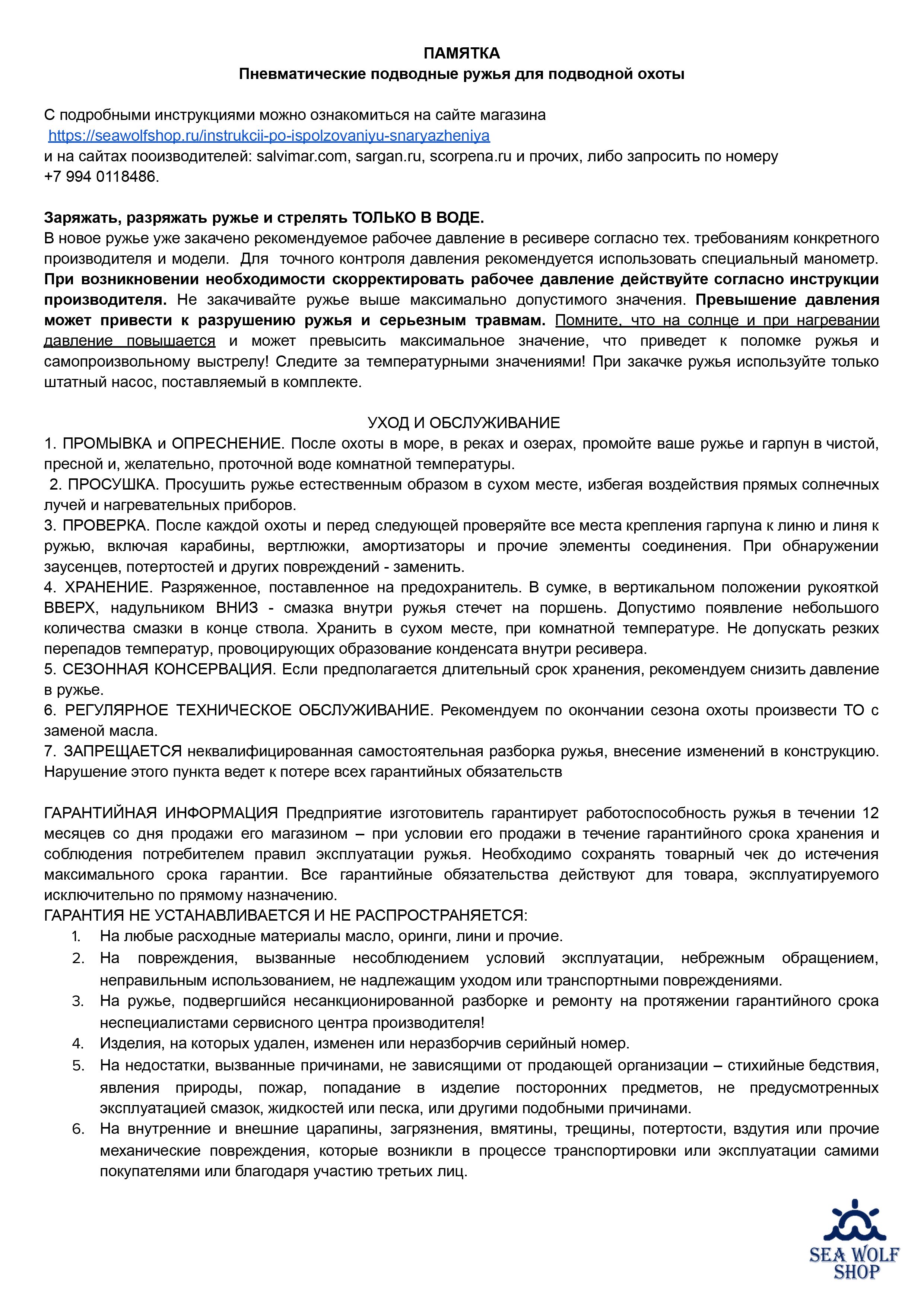 Инструкцию по использованию ружья SEAC SUB ASSO S/R можно скачать по ссылке: https://www.seacsub.com/wp-content/uploads/2021/02/PNEUMATIC_User_Manual-1.pdf