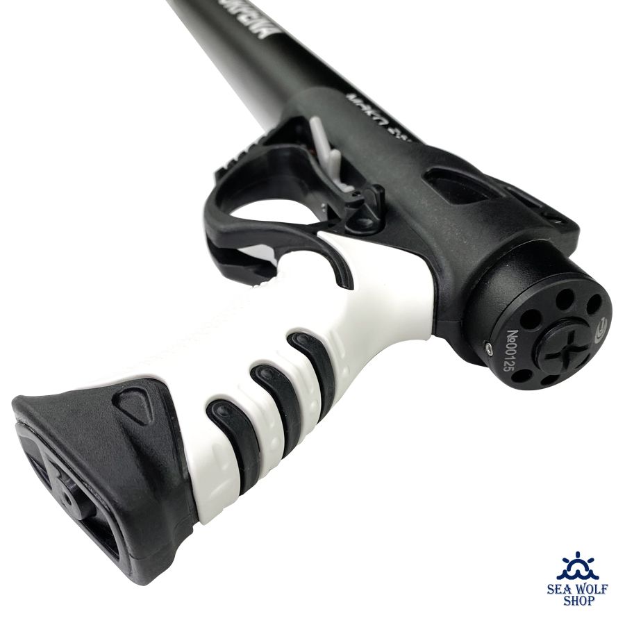 Форма, размер и эргономика рукоятки рассчитана на интуитивное прицеливание и стрельбу «навскидку», в том числе из неудобных и неустойчивых положений, то есть не столько для стендовой, сколько для практической подводной охоты. Рукоять имеет специальное упругое и противоскользящее покрытие для удобного и хваткого удержания её правой или левой рукой, как в перчатке, так без неё. Эта белая фигурная накладка выполнена в белом цвете для более легкого обнаружения ружья, если вы его случайно выпустили из рук в мутной воде. Спусковая скоба позволяет охотиться в толстых «зимних» перчатках. Армированный композитный материал, используемый в основе рукояти, считается самым прочным и легким в своем классе.