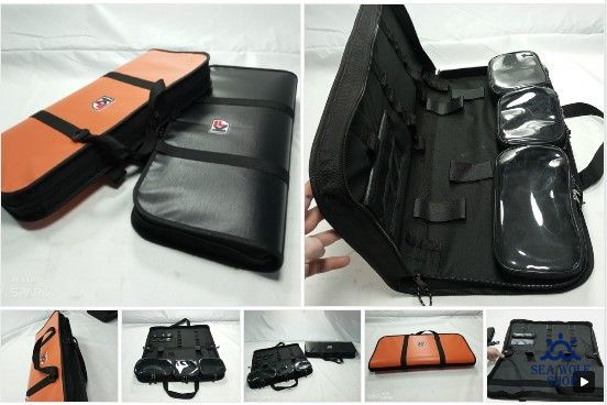 Три бокса:- для маски,трубки,фонаря. Отделения для гарпунов,для наконечников,насоса и трезубцев. Сумка имеет пластиковые вставки.