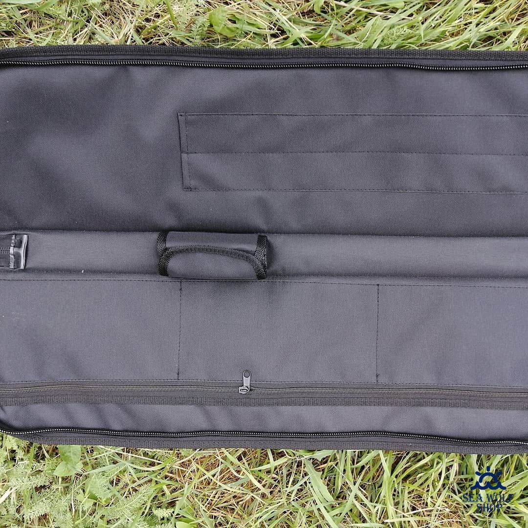 Для удобного хранения наконечников и прочих аксессуаров предусмотрены специальные отделения на молнии. Широкая липучка для крепления ружья надежно удерживает его при любом типе транспортировки. Преимуществом данного чехла является то, что он может быть разложен так, что будет выполнять роль некого «стола» на котором возможно будет провести различного рода работы (сборка, ремонт, разборка и т. п.).